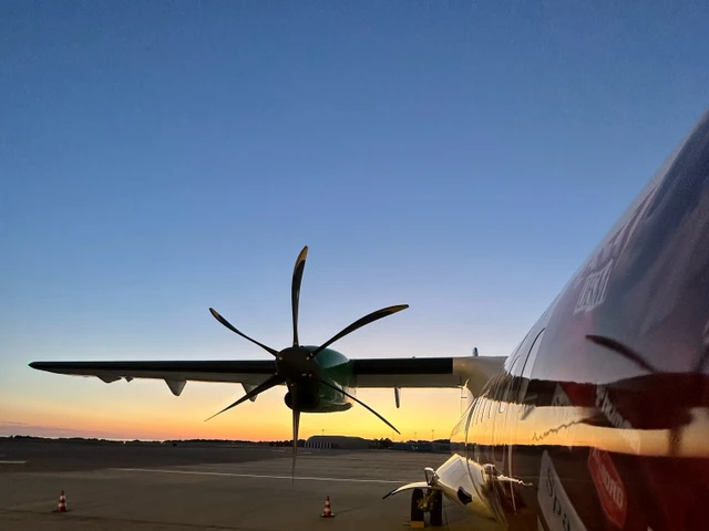 Solopgang over Bornholms Lufthavn. Morgenens to første fly står klar på rampen med afgang kl. 06.15 og 07.00. Vi ønsker alle en rigtig god dag.