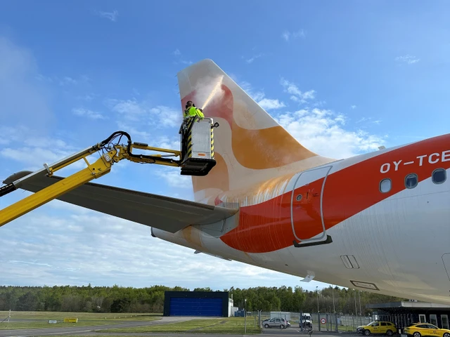 Her ses de-icing af et charterfly før det fløj afsted mod Rhodos. De-icing er en vigtig procedure der sørger for, at flyene bliver frie for sne, is og frost.