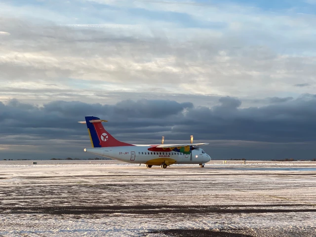 Et DAT fly klar til afgang i vinterhimlen. Fra Bornholms Lufthavn er der mange afgange til både Billund, Aalborg og København.