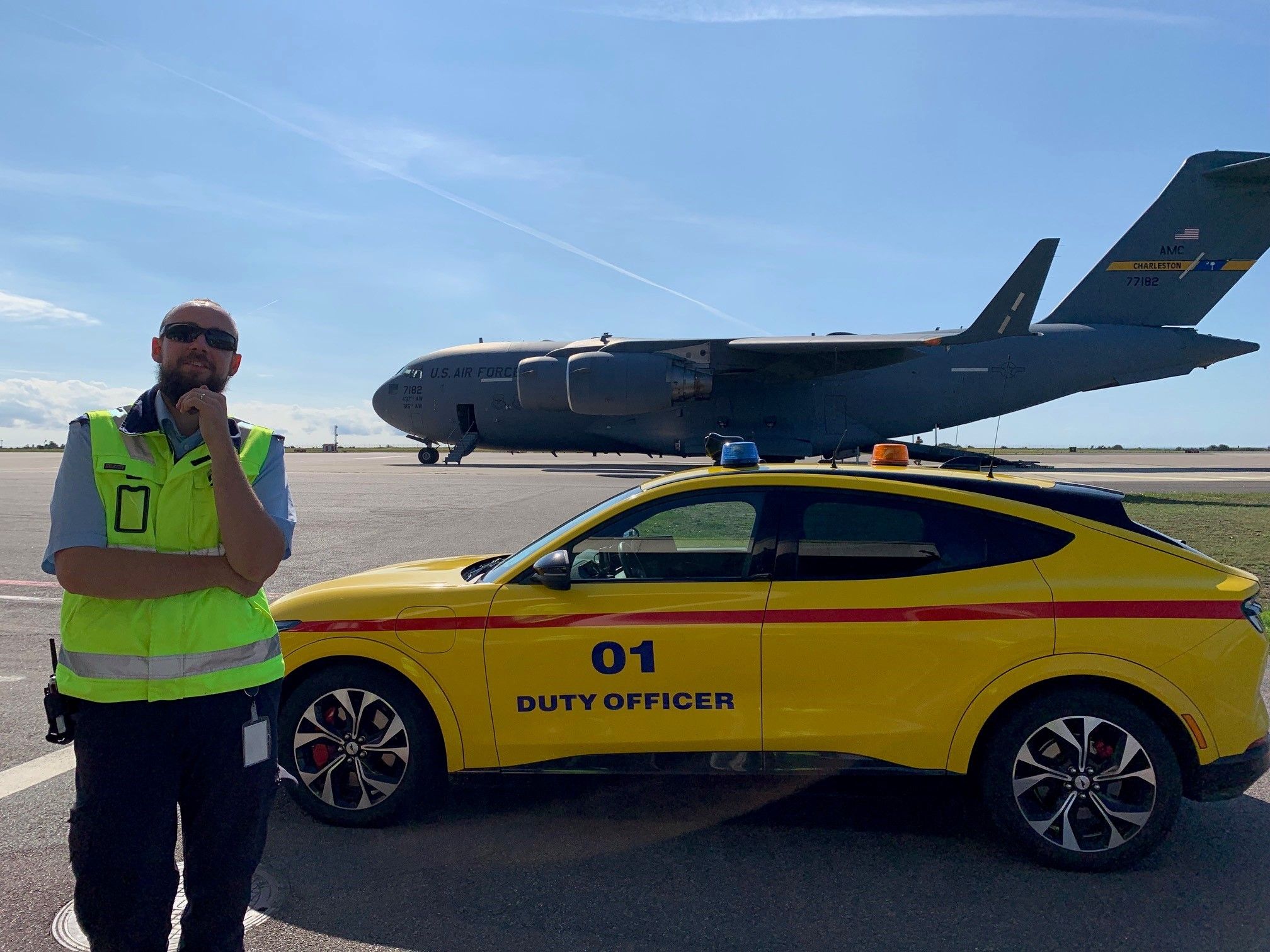 Vagthavende Marco og vores nyvaskede indsatsbil poserer foran et amerikansk transportfly.
